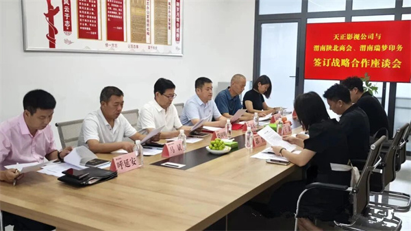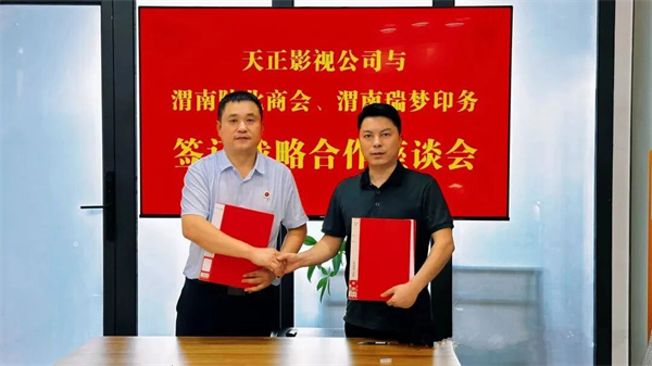 战略合作协议签订仪式在渭南市陕北商会举行。仪式上,天正影视与渭南市陕北商会的代表分别发表开场致辞,双方就合作愿景、发展方向等内容进行了简要阐述。随后,在与会人员的共同见证下,双方代表正式签订战略合作协议,并合影留念,记录下这一重要时刻。