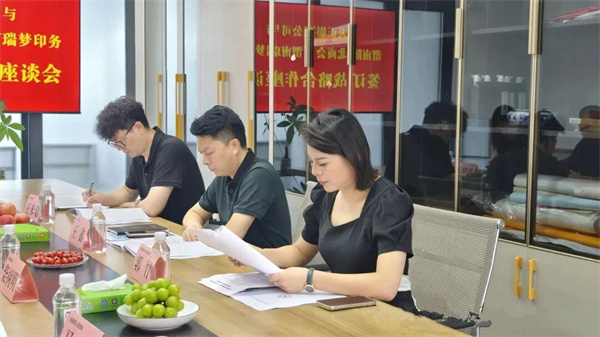 参观结束后,与会代表在瑞梦印务会议室进行了座谈交流。会上,西安天正影视总经理王鑫、体育传媒媒体总监王钊,西安铭泽知识产权事务所的郭竹,渭南市陕北商会党支部书记柴树明、会长王志元、理事及平安人寿渭南中心支公司银保总经理呼延安,渭南市瑞梦印务董事长刘润合、经理姚晓艳,渭南市退役军人就业创业促进会秘书长马斌纷纷发言,围绕行业发展趋势、资源整合、合作机遇等话题展开了热烈地探讨交流,现场气氛活跃。