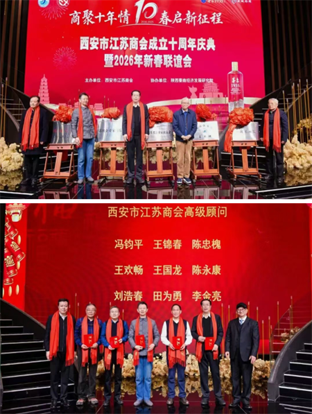 陕商讯:十年商聚结硕果 苏陕协作启新程。1月28日,西安市江苏商会十周年庆典暨2026年新春联谊会于汉城盛宴盛大举行。陕商会顾问、省政协原副主席陆栋、张生朝,省工商联原主席冯钧平,原副主席李建军,省商务厅原副厅长王国龙等省市领导出席大会,省经济发展促进会会长齐亚平、秘书长汪涵受邀参加,与相关领导、各界嘉宾、各兄弟商会代表及西安市江苏商会全体会员齐聚一堂,共忆商会十年发展路,共探苏陕协作新机遇。